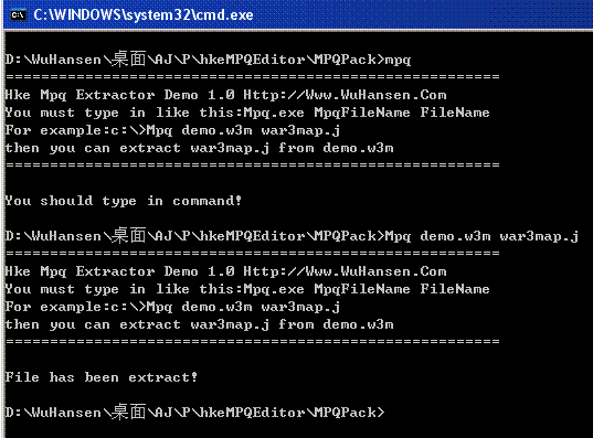 程序使用很简单,假设程序名MPQ.exe,有个mpq文件demo.w3m包含war3map.j要把它解压出来,输入mpq demo.w3m war3map.j即可.